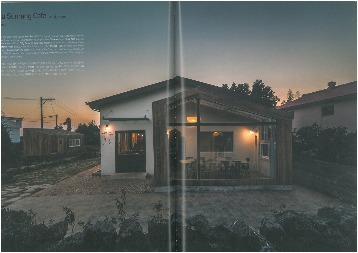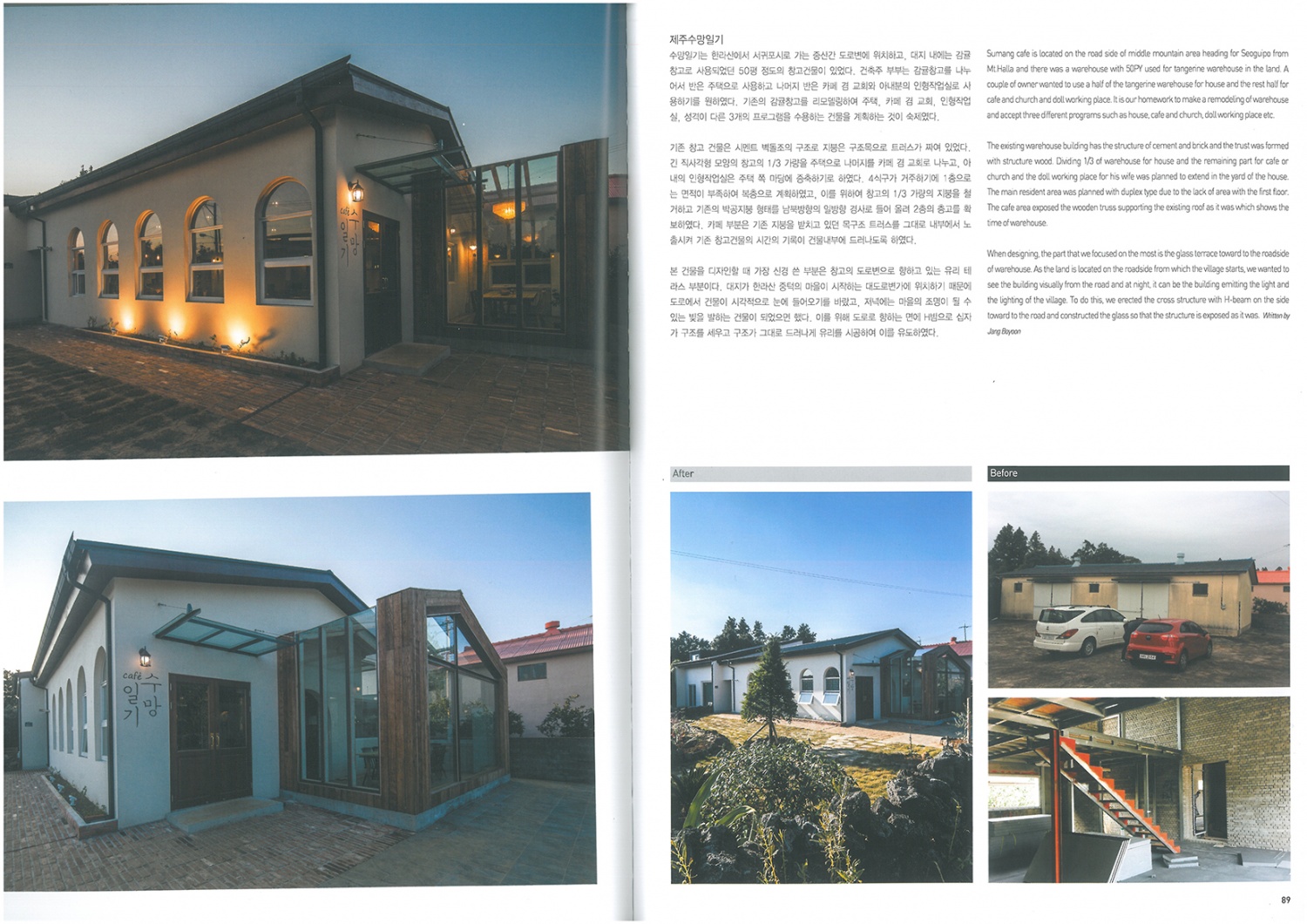 수망일기는 한라산에서 서귀포시로 가는 중산간 도로변에 위치하고 있습니다. 기존 대지 내에 감귤창고로 사용되었던 50평 정도의 창고건물이 있었는데, 이 창고건물을 리모델링하여 주택, 카페 겸 교회, 인형작업실 등 성격이 다른 세 개의 프로그램을 수용하는 공간을 계획하고, 설계, 시공한 프로젝트입니다.